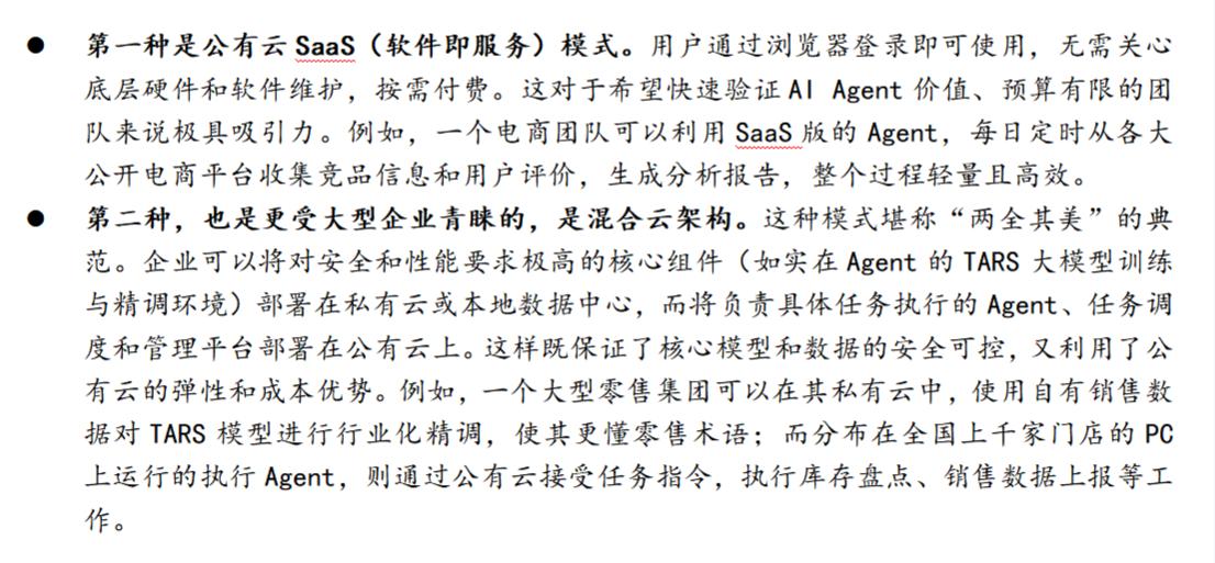 在金融行業,除了數據安全,對業務連續性和系統穩定性的要求也極高。因此金融機構傾向于構建私有化云平臺。實在Agent可以作為PaaS(平臺即服務)層的一個核心能力,被集成到銀行自有的云平臺中,與行內的風控、審計、運維體系深度融合。其“大腦”(TARS大模型)與“手腳”(ISSUT執行器)分離的架構,天然適合這種平臺化集成,讓銀行在享有AI能力的同時,保持對整個技術棧的完全掌控。